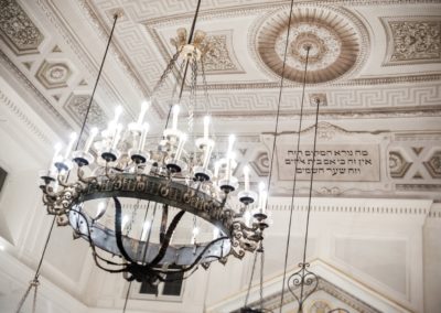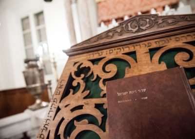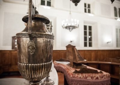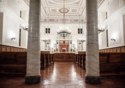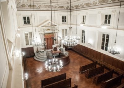 Nell’organizzazione della sala si è invece tenuto conto del nuovo modo di partecipazione religiosa, che esalta la figura dell’officiante. Per questo motivo all’Aròn, l’arca contenente i rotoli della Torah, è stata avvicinata la Tevà o Bimà, il podio per la lettura e la recita delle preghiere pubbliche, creando un’unica grande composizione, situata nella zona est della sala rettangolare, il cui ingresso, sul lato corto, è accentuato da due file di colonne che reggono il matroneo. Le panche, in legno di noce intagliato, sono sistemate in parallelo ed orientate verso l’Aròn; solo una fila di sedili corre lungo le pareti, cui è attaccata. Lo spazio della sala è coperto da una volta a padiglione, in forma grande vela gonfiata, decorata, secondo la legge ebraica che vieta le rappresentazioni figurative, con motivi geometrici.
